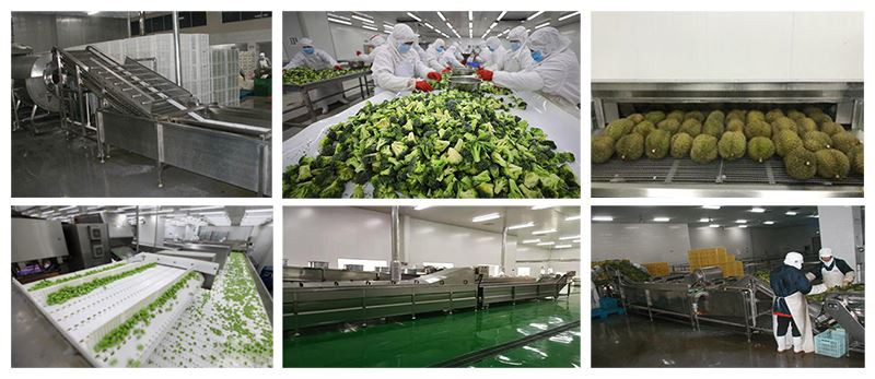 सेब के पासा, आम क्यूब, ड्रैगन फ्रूट, स्ट्रॉबेरी, चेरी, बीन्स, मटर, मक्का अनाज, शतावरी, आम कैला, तारो, मशरूम, फूलगोभी, कमल की जड़, प्याज, आदि के लिए हमारी त्वरित जमे हुए फल प्रसंस्करण लाइन सूट करती है।