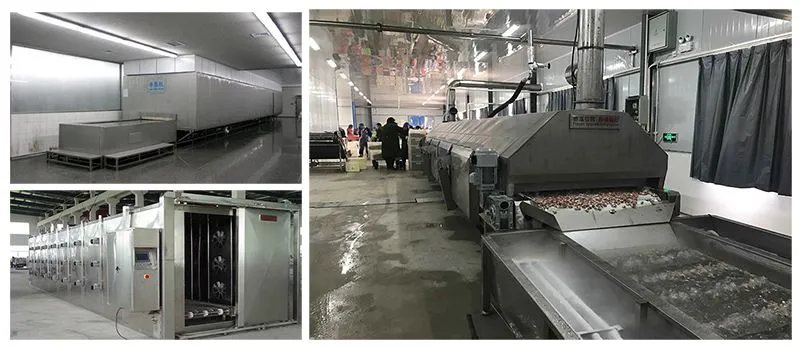 प्रीट्रीटमेंट (पिकिंग, सॉर्टिंग, कटिंग, पीलिंग, स्लाइसिंग) → बबल क्लीनिंग → स्क्रू ब्लैंचिंग या नेट-बेल्ट ब्लैंचिंग → प्रीकूलिंग इन वॉटर → आइस वॉटर कूलिंग → वाइब्रेशन वॉटर ड्रॉपिंग → क्विक-फ्रीजिंग